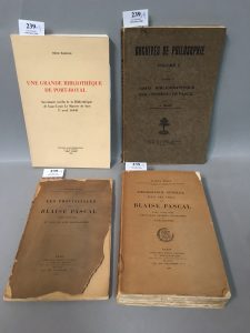 V. Opuscules, lettres, bibliographie et iconographie de B.P. P., Giraud Badin, 1917, in-8 broché. 380 pp. - MAIRE (A.). Essai bibliographique des Pensées de Pascal. P., Beauchesne, 1924, in-8 broché. 211 pp. (Archives de Philos.-I-5). - BARENNE (O.). Une grande bibliothèque de Port-Royal. Inventaire inédit de la bibliothèque de Isaac-Louis Le Maistre de Sacy. (7 avril 1684). Paris, 1985, in-8 br. 244 pp. Soit 4 volumes.