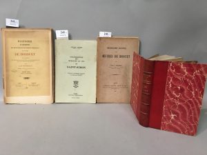 259 pp. - VERLAQUE (V.). Bibliographie des oeuvres de Bossuet. P., Picard, 1908, in-8 broché (dos cassé). 8-140 pp. - BOURSEAUD (H.M.). Histoire et description des manuscrits et des éditions originales des ouvrages de Bossuet avec l'indication des traductions qui en ont été faites... Nouvelle édition revue et augmentée. P., Saintes, 1898, in-8 débroché. 37-232 pp. Soit 4 volumes.