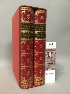 [Voltaire]. L'oeuvre imprimé de Voltaire à la Bibliothèque Nationale. Paris, 1978, 2 vol. in-8, reliure plein chagrin rouge, dos orné style du XVIIIème s., sous étui. Tome 214 du catalogue général de la BN (2 vol.) qui recense 5618 notices....