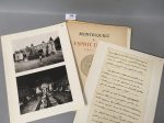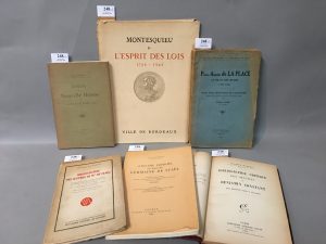oeuvres de Benjamin Constant. P., 1909, in-8 demi-toile moderne, 108 pp. - MONTESQUIEU et l'Esprit des Lois. 1748-1948. Bordeaux, s.d., in-4 en ff. sous chemises édit. (dos usé). Recueil de planches et de fac-similés d'autographes. - MORNET (D.). Le texte de la Nouvelle Héloïse et les éditions du XVIIIe siècle. Genève, 1910, in-12 br. 115 pp. 51 éd. Répertoriées. - COBB (Lilian). Pierre Antoine de La Place. Sa vie et son oeuvre (1707-1793). P., 1928, in-8 broché (couv. usée). 227 pp. Portrait. Soit 6 volumes.