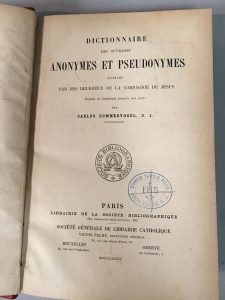 SOMMERVOGEL (C.). S.J. Dictionnaire des ouvrages anonymes et pseudonymes publiés par des religieux de la Compagnie de Jésus depuis sa fondation jusqu'à nos jours. P., 1884, in-8, demi-basane. 3 pp. et 1398 colonnes.