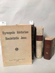 colonnes. On joint : - HAMY. Documents pour servir à l'histoire des domiciles de la Compagnie de Jésus dans le monde entier, de 1540 à 1773. P., (1892), in-folio, demi-basane (dos frotté). 96 pp. - BRUCKER (J.). La Compagnie de Jésus. Esquisse de son institut et de son histoire (1521-1773). P., 1919, Deuxième édition. Fort in-8, demi-chagrin moderne. - SYNOPSIS HISTORIAE SOCIETATIS JESU. Lovanii, 1950, in-4 broché. Soit 4 volumes.
