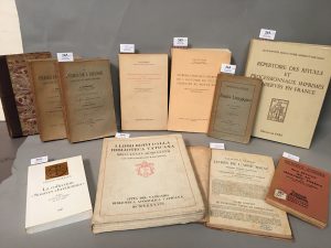 Spoleto, 1981, in-8 br. 407 pp, - CABROL (dom F.). Introduction aux études liturgiques. P., 1907, in-12 broché. 169 pp. Rousseurs - CABROL (dom F.). Les livres de la liturgie latine. P., 1930, in-12 br. - MOLIN (J.-B.) & A. AUSSEDAT-MINVIELLE. Répertoire des rituels et processionnaux imprimés conservés en France. P., C.N.R.S., 1984, in-4 toile de l'éd., 716 pp. (Doc., Ét. & Répert. I.R.H.T.). 2952 notices, pls. index des impr./libraires (lieux, noms, chronol.). - BARDENHEWER (O.). Les Pères de l'Eglise, leur vie et leurs oeuvres. P., 1898... 3 vol., (2 vol. brochés et 1 demi-chagrin, coiffe de tête usée). Donne pour chaque auteur : manuscrits, éditions, travaux. - BIBLIOTECA VATICANA. I libri editi dalla Biblioteca Vaticana. 1885-1937. Catalogo ragionato e illustrato. Roma, 1937, in-4 br. LII-186 pp. 6 pl. - MIGNE. Catalogue général de l'abbé Migne. P., s.d., in-8 demi-perc. 160 pp (Patrologies grecque, greco-latine, latine, Encyclopédie théologique, orateurs sacrés etc.). - FOUILLOUX (E.). La collection « Sources chrétiennes »... P., 1995, in-12 br. 238 pp. Soit 11 volumes.
