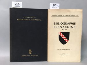 JANAUSCHEK (L.). Bibliographia bernardina... Hildesheim, 1959, in-8 toile éd. 557 pp. On joint : LA CROIX BOUTON (J. de). Bibliographie bernardine. 1891-1957. P., 1958, in-8 br. (Continue et complète Janauschek). Soit 2 volumes.