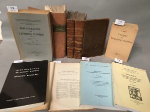 siècle. Première période. Publications faites depuis l'origine de l'imprimerie jusqu'en 1870 inclusivement. P., 1880, 2 parties en un fort in-8 pleine toile moderne, pagin. continue, XI pp.-1731 col On joint : - BOUILLET (N.). Dictionnaire classique des noms propres de l'Antiquité sacrée et profane, etc... Deuxième édition. P., Belin-Mandar, 1828, 2 vol. in-8, plein veau de l'époque (3 coins émoussés, frottements). 682 + 660 pp. - BESNIER (M.). Lexique de géographie ancienne. P., 1914, in-12 br. 893 pages. - LAMBRINO (S.). Bibliographie de l'Antiquité classique (1896-1914). Première partie : auteurs et textes. P., Belles-Lettres, 1951, in-8 broché. 16-760 pp. (Coll. de Bibliogr. classique). - ÉCOLE FRANÇAISE DE ROME. Mélanges d'archéologie et d'histoire. Tables des tomes 1-82 (1881-1970). Rome, 1977, in-8 broché. 253 pp - MARTIN (A.). Latomus. Table des travaux publiés dans la collection et dans la Revue (comptes rendus exceptés). 1937-1996. Bruxelles, 1999, in-8 br. , 237 pp. - ROME. Bibliografia di storia antica e diritto romano. Roma, 1971, in-8 br. 257 pp. Plus de 7000 entrées. - REVUE DES ÉTUDES GRECQUES. Table générale. 1918-1937. in-8 br., couv. muette, 88 pp. Soit 9 volumes.