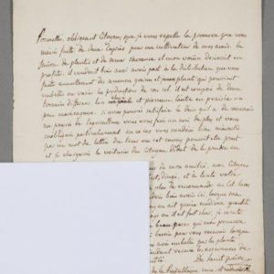 Il lui rappelle la promesse de plantes qu'il a faite à un de ses amis cultivateurs. « La saison de planter et de semer s'avance et mon voisin désireroit en profiter. Il voudroit bien aussi avoir part à la distribution que vous faites annuellement des semences, graines et jeunes plants qui pourroient embellir ou varier les productions de son sol. Il est composé de deux terrains différens. L'un élevé et pierreux, l'autre en prairie un peu marécageuse. Si vous pouvés satisfaire le désir qu'il a de concourir au progrès de l'agriculture, vous vous ferés un ami de plus [] ». Dans ce cas il lui fera parvenir le voiturier du citoyen Didot [il venait d'épouser sa fille, Félicité]. « Je vous prie de réitérer les assurances de mon amitié aux citoyens Daubenton, Vanspandonck, Guilbert, Dingé, et à toute votre aimable famille. Je vous prie de plus de recommander au Cit. Lucas le souvenir de mon vin que je voudrois bien avoir ici, lorsque ma maison sera habitable ». Il compte l'échanger avec son beau-père [Didot]. « J'en aurai besoin pour vous recevoir lorsque vous viendrés voir les lieux que vous avés embellis par les plantes que vous m'avés envoyées [] ». [Il est probable que cette livraison lui était en fait destinée à la propriété qu'il aménageait sur l'îlot d'Essonne à l'emplacement de l'ancienne papeterie de Didot, son beau-père].