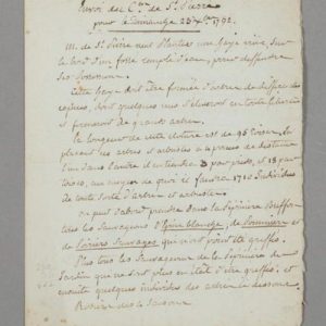 Important manuscrit concernant les plantations de la propriété qu'il aménage sur l'îlot de la rivière Essonne à partir de fin 1792 sur l'emplacement de l'ancienne papeterie Didot (propriété détruite en 1974). Il se fait expédier pas moins de 1710 arbres et arbustes. « M. de St Pierre veut planter une haye vive sur le bord d'un fossé rempli d'eau, pour deffendre ses possessions. Cette haye doit être formée d'arbres de différentes espèces, dont quelques uns s'élèveront en toute liberté et formeront de grands arbres. La longueur de cette clôture est de 95 toises. En plaçant ces arbres et arbustes à 4 pouces de distance, l'un dans l'autre, il en tiendra 3 par pied, et 18 par toise, au moyen de quoi il faudra 1710 individus de toutes sortes d'arbres et arbustes. On peut d'abord prendre dans la pépinière Buffon tous les sauvageons d'épine blanche, de pommiers et de poiriers sauvages qui m'ont point été greffés. Plus tous les sauvageons de la pépinière du Jardin qui ne sont plus en état d'être greffés. Et ensuite quelques individus des arbres ci-dessous. » Suit une longue liste des différentes espèces avec leur nombre : « Rosiers de Virginie 100. Spirées à feuilles de millepertuis 6. Lilas blanc, lilas rouges 6. Arbres de Judée 50 [] ».