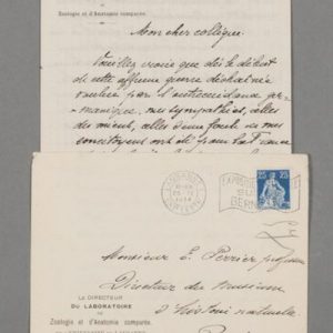 Henri Blanc (1859-1930), zoologiste suisse, conservateur du Musée cantonal de Zoologie de Lausanne. L.A.S. au zoologiste Edmond Perrier (1844-1921), directeur du Muséum. Lausanne, 25 septembre 1914. 4 pp. in-8, en-tête du Laboratoire de Zoologie et d'Anatomie comparée. Enveloppe conservée.
