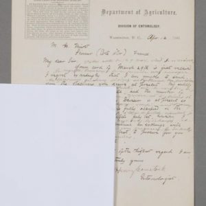 Comstock regrette de ne pouvoir envoyer les spécimens d'insectes demandés par Miot, n'en ayant presque plus en double. « I regret extremely that I am unable to send you the specimens you desire at present. My supply of duplicatas is very limited, and the number of employers attached to my division is at present so small that this time is fully occupied in the regular business ». Il pourra de nouveau correspondre avec lui dès juillet.