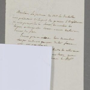 Acclimatation de plantes pour la duchesse d'Enville. « Le jardinier de Me la Duchesse vous présentera de sa part des graines d'Angleterre en vous priant de les semer, de vouloir les soigner, et lorsqu'elles seront venues de lui en donner des plans. Je vous prie en même temps de vouloir charger un de vos garçons de lui faire voir vos pépinières [] ». [La duchesse d'Enville (1716-1797), femme des Lumières, amie de Voltaire, Turgot et des physiocrates ; elle tint un salon littéraire et accueillit Condorcet en son château de La Roche-Guyon].