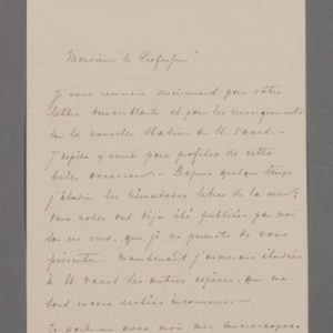 Il remercie Perrier des renseignements transmis sur la nouvelle station de Saint-Vaast. « J'espère y venir pour profiter de cette belle occasion. Depuis quelques temps j'étudie les nématodes libres de la mer ; deux notes ont déjà été publiées par moi sur ces vers, que je me permets de vous présenter. Maintenant j'aimerais étudier à St Vaast les autres espèces, qui me sont encore restées inconnues. Je porterai avec moi mes microscopes [] ».