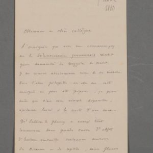 Identification d'une araignée. « L'araignée que vous me communiquez est le Selenocosmia javanensis Walck, genre démembré des mygales de Walck. Je ne connais absolument rien de ses moeurs. Dans l'état pitoyable où elle est, cette araignée ne peut être préparée [...]». Il évoque les envois du naturaliste et erpétologiste Victor Collin de Plancy (1853-1922) qui voyage en Chine. « M. Collin de Plancy a envoyé tout récemment deux grandes caisses d'objets d'histoire naturelle contenant surtout des oiseaux et des reptiles ; deux flacons d'arachnides qui m'étaient destinés ne renfermaient que peu d'espèces et plusieurs individus du Bultus confucios ; il faut croire qu'il n'y a qu'une seule espèce de scorpion à Pékin. Je vous remercie à l'avance pour les arachnides du Sénégal ; je ne possède presque rien de cette région [...] ». Rare.