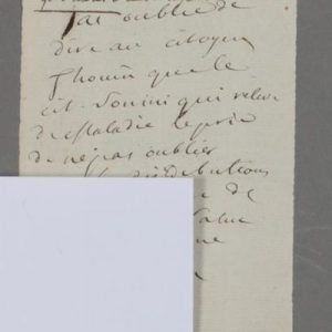 « J'ai oublié de dire au citoyen Thouin que le cit. Sonini [le naturaliste Charles-Nicolas-Sigisbert Sonnini de Manoncourt (1751-1812)] qui relève de maladie le prie de ne pas oublier dans les distributions le cit. Willemet de Nancy [l'apothicaire nancéien Rémy Willemet (1735-1807) ». Thouin a noté en haut : « Au c. Sonnini donné 60 espèces de gr[aines] d'arbres et de pl. agréables ».