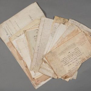 Calvados. Papiers de la famille Drudes de Campagnolles, une quarantaine de documents XVIe-XIXe. La plupart annotés au dos en 1789 par Toustain de Richebourg, pour les authentifier.