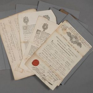 Passeport révolutionnaire (1792), congé militaire (1728), 2 certificats de non maladie contagieuse (1763-1766), certificat de la confrérie de la Croix de Besançon (1785), almanach imprimé « Dieu soit beny » (1759), 6 documents manuscrits (contrats de mariage, inventaire de biens, etc.) concernant des familles comtoises (Pusel, Oyselet de Legna, Roussel, etc.), un état des revenus de Saint-Antoine de Salins (32 pp. in-folio, 1788-1791), une affiche et 2 imprimés bisontins (1778-an 11), affiche bisontine de 1682 concernant le recensement pour le sel, 3 parchemins divers XVIe-XVIIIe (dont expédition d'un document de 1315), 2 documents religieux bisontins XVIIe-XVIIIe, un extrait des délibérations de l'hôtel de ville de Besançon concernant le projet d'une nouvelle rue (1785), 2 lettres signées du maréchal de Langeron (1789-1790), ainsi qu'une vingtaine de documents XVIe (certains fort intéressants concernant Besançon).