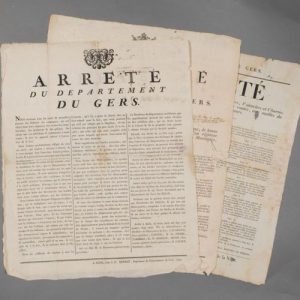 - Arrêté du département du Gers relatif aux pillages dans les campagnes du département (Auch, 13 août 1791). « Nous recevons tous les jours de nouvelles plaintes des Habitans des campagnes, qui ont essuyé dans leurs demeures des recherches inquisitoriales, des spoliations et des pillages. On ajoute que ces infractions se font à main armée [] ».