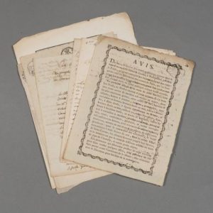 - « Avis » imprimé, d'époque révolutionnaire, annonçant l'ouverture d'une salle de ventes aux enchères dans l'hôtel St Cosme de Montpellier. - Carte d'entrée pour la cérémonie du Sacre en la basilique cathédrale de Montpellier le 24 février 1900. L.A.S. de Soeur Hyacinthe « procuratrice du monastère de Ste Ursule de Lodève (1742, 2 pp. in-4). Longue lettre d'un prisonnier (maison d'arrêt de Pézenas, floréal an 3, 6 pp. in-4). Lettre d'un prêtre n'ayant pas prêté serment, suivie d'une attestation de la main du représentant du peuple en mission dans le département de l'Hérault, Jean-Baptiste Girot-Pouzol (1753-1822). Certificat de vaccination (Mèze, 1820). Certificat délivré pour l'ex-curé de Maugio (an 4). Imprimé : « Proclamation du Roi sur un décret de l'Assemblée nationale, relatif aux citadelles, forts et châteaux qui existent actuellement dans le Royaume & notamment à la citadelle de Montpellier » (18 juin 1790).