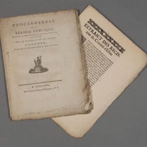 - Imprimé de l'an III : « Procès-verbal de la séance publique tenue pour la réorganisation des autorités constituées séantes à Orléans par le représentant du peuple Porcher, envoyé dans les départements de l'Indre-et-Loire et du Loiret » (49 pp. in-4).