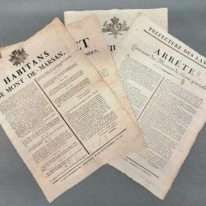- « Le Conseil général du département des Landes, en permanence, à ses concitoyens ». « Un tyran qui avait asservi la France luttait alors contre l'Europe entière ; ce même tyran ose reparaître aujourd'hui sur le sol de France qui le repousse ; il veut armer Français contre Français []. Vive Louis-le-Désiré ! Vivent à jamais les descendans de Henri ! [] ». Sans date.