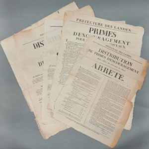 « Prime d'encouragement pour l'élève des chevaux » (1821), arrêté pour la « distribution de primes d'encouragement pour l'élève des chevaux en 1830 », 2 affiches pour 1833 et 1834 : « Distribution des primes d'encouragement pour l'élève des chevaux », et « primes d'encouragement pour l'amélioration de la race bovine » (1834).