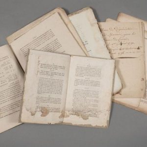 - Statuts et règlements de la Société des amis de la constitution de la ville d'Orléans (1790, 15 pp. in-8, déchirures au bas de pages). - Fêtes de l'Être Suprême et à la Nature. Programme des festivités. Orléans, 15 prairial an 2. 4 pp. in-folio. - Extrait du registre des délibérations du Directoire de Gien, séance du 3 pluviôse an 2. 4 pp. in-4, 2 exemplaires. - Compte des opérations de la municipalité d'Orléans depuis le 31 décembre 1792, jour de son installation, jusqu'au 22 mars suivant, époque de sa suspension. 81 pp. in-4. - Suite du procès-verbal des séances tenues dans l'Église Saint-Paterne d'Orléans, par le citoyen Laplanche, représentant du Peuple dans le département du Loiret. 84 pp. in-4. Imprimé chez L.P. Couret, à Orléans. [Assignats]. Imprimé de 16 pp. in-4 + page de titre, chez Couret & Capmartin à Orléans, [1797]. « Tableau de dépréciation du papier-monnoie, fait par l'administration centrale du Loiret, en exécution de la loi du 5 messidor an 5 - Cours des assignats dans le département du Loiret, depuis le 1er janvier 1791 jusque et compris le 30 ventôse an 4 » (ou 20 mars 1796). - Formules d'imprécation contre les parjures, et d'invocation à l'être suprême, rédigées et arrêtées par les professeurs de l'École centrale & approuvées par l'administration départementale, pour être chantées dans toutes les communes du département du Loiret, à la fête du 2 pluviôse an 7. 4 pp. in-4. Imprimé à Orléans chez Jacob l'aîné.