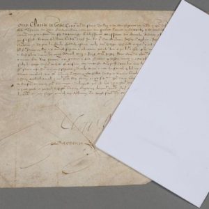 Orne. Pièce signée par Claude de Gobé « capitaine pour le service du Roy des ville et château d'Alençon ». Parchemin, 29 x 22 cm. Alençon, 27 juillet 1584.