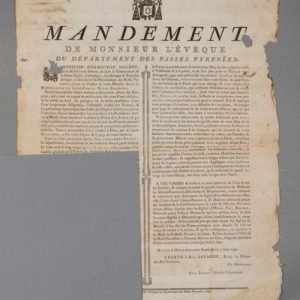 Pyrénées-Atlantiques. Affiche, 52 x 42 cm, imprimée à Pau chez J. P. Vignancour. Quelques défauts (2 trous). Oloron, 7 juin 1791.