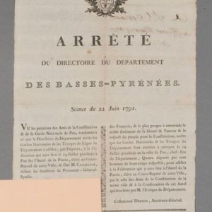 Fête de la Fédération à Pau. Arrêté du Directoire du département des Basses-Pyrénées du 22 juin 1791 qui « arrête que les Gardes nationales & les troupes du département sont invitées à envoyer le 14 juillet prochain en la ville de Pau, chef-lieu du département, quatre députés par cent hommes de leurs corps respectifs, pour assister à la Fédération qui y aura lieu à l'Autel de la Patrie, élevé Cours-Bayard de cette ville [] ».