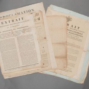 Pyrénées-Atlantiques. 16 affiches de la Révolution. Imprimées à Pau, chez Daumon, Vignancour, Véronèse, ou Sisos et Tonnet, 1793-an 13. Quelques petits défauts.