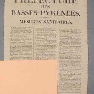 Mesures sanitaires prises par le préfet des Basses-Pyrénées, relatives à la fièvre jaune espagnole provenant de Catalogne. « Article premier : toute communication par terre entre l'Espagne et le département des Basses-Pyrénées n'aura lieu, jusqu'à nouvel ordre, que par la route royale d'Irun à Bayonne. Art II. Il sera établi un lazaret provisoire sur le point de cette route le plus voisin de la frontière, le plus isolé et le plus approprié à une telle destination [] ». 31 articles au total.
