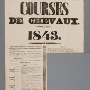 « Courses de chevaux. 1843 ». Programme des courses de « chevaux entiers et juments de tout âge et de toute origine, nés et levés dans le département des Basses-Pyrénées » qui se déroulèrent à l'hippodrome de Pau devant le duc de Montpensier, du 23 au 27 août 1843.