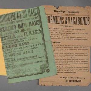 - Arrêté du préfet des Hautes-Pyrénées concernant les Bohémiens et vagabonds « ou autres individus nomades, sans profession avouée », leur interdisant « de stationner, avec les voitures qui servent à les loger, sur les voies publiques ou sur les terrains communaux ». Tarbes, 26 juin 1897.