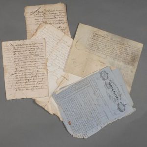 - Divers documents manuscrits XVIIe : extrait de l'assiette des deniers extraordinaires du diocèse d'Albi (1654), 2 contrats d'achat faits à Lescure-d'Albigeois (1636-1666), procuration (Albi, 1617).