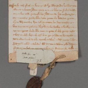 Tarn-et-Garonne. Charte datée d'octobre 1349 (et non 1249 écrit par erreur par omission d'un « c », car suit la mention « philippo regnante » correspondant au règne de Philippe VI de Valois). 16,5 x 17,5 cm. Scellée par un magnifique sceau en ogive, complet et intact, d'une très belle empreinte d'une tour entourée de la légende « Attoni Drudae ». En latin. Petit dessin représentant cette même tour en bas de la charte.