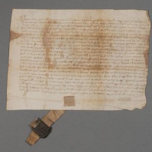 Rare charte médiévale scellée d'un sceau fleurdelisé. Parchemin émanant de Pierre de Belarbre garde du scel de Civray pour le duc Jean de Berry, comte d'Auvergne et comte de Poitou devant lequel ont comparu Simon Delépine et un certain Maciac. Le premier confesse et avoue devoir le prix de la jouissance du bien d'une nommée Richarde, femme de feu Jehan Babonau, qui revenait au second. Les parties transigent pour éviter procès, moyennant le versement d'une somme de 40 sous. Témoins Simon Leulet et Lorent Daguin.