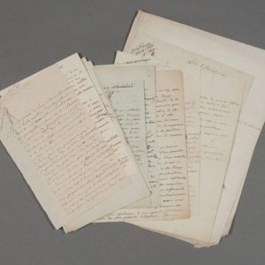 Très intéressante correspondance principalement consacrée au château de CHAMPLÂTREUX, ses aménagements, et les tableaux d'HUBERT ROBERT. Propriété de la famille Molé, le château de Champlâtreux, sous l'ancien régime, bénéficie d'un luxe inouï avec quatre grandes salles d'apparat et 23 chambres. Mais durant la Révolution, le mobilier est dispersé et le château transformé en hôpital militaire. Mathieu Molé s'emploie alors à le remettre en état et le remeubler. « Je suis convenu, monsieur, avec M. Robert qui fait en ce moment 4 gds tableaux et deux dessus de porte pour le sallon de Champlatreux, que vous lui payeriez quand il le demanderait le montant des toiles et des bordures, sur les quittances des fournisseurs []. [L'inventaire du cabinet d'Hubert Robert indique, en effet, sous le n°110 : « Quatre [projets de composition] de forme étroite en hauteur, projets de tableaux de place, qui ont été exécutés pour le Château de Champlatreux »]. Mais visiblement les tableaux ont subi des dégradations. « Je lui ai dit aussi de vous avertir dans le cas où l'hiver gâteroit encore les tableaux afin que de concert avec M. Robert vous décideriez ce qu'il y auroit à faire sur le champ pour les préserver [] ». Nouvelles acquisitions de meubles. « Malgré les acquisitions que y avez faites, j'ai été forcé d'acheter encore beaucoup de meubles [] ». 8 frimaire à midi. « Je m'empresse de vous instruire Monsieur de la triste position dans laquelle ma soeur et moi allons nous trouver. Les percepteurs pour l'an 8 des communes de Jagny et Champlatreux ont fait une saisie réelle de tous les meubles du château et ils se disposent à procéder à la vente dans deux jours []. Cela ne fait que prouver ce que je savois déjà, c'est qu'étant le seul grand propriétaire dans ce canton nous sommes les plastrons de tous les coquins