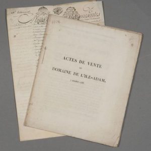 - Actes de vente du domaine de l'Île-Adam, 7 octobre 1783. Brochure de 34 pp. in-4. Vente faite par le prince de Conti à Monsieur frère du Roi.