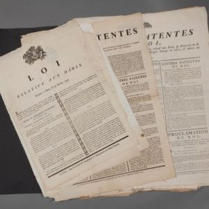 Loi relative aux haras (25 février 1791). Loi relative à l'enseignement public dans les différents Collèges du royaume (28 oct. 1791). Arrêté relatif aux marchandises anglaises et à la marque qui doit être apposée sur les étoffes existant dans les magasins (3 brumaire an 10). Lettres patentes du Roi concernant la suppression de l'exercice du droit de marque des cuirs (24 mars 1790). Lettres patentes sur les droits de propriété et de voyerie (15 août 1790). Sur les gardes nationales (18 juin 1790). Sur la police des spectacles (grande affiche, 17 juin 1790). Sur le recouvrement des impositions (3 février 1790). L'interdiction des marchandises anglaises (18 vendémiaire an 2). La distribution des armes pour la défense de la Patrie (26 août 1792). La suppression de toutes les chambres de commerce du Royaume (16 oct. 1791). L'allocation de 3 millions au département des Ponts & Chaussées (25 juillet 1791). Le transport des grains, farines & autres denrées destinés à la commune de Paris (28 fructidor an 3). Proclamation du ministre de la Guerre Milet-Mureau (« Braves guerriers »). Sur la libre circulation des grains (27 nov. 1791), etc.