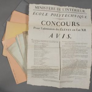 7 affiches pour le concours d'entrée à l'Ecole Polytechnique (an 11-1813), idem 4 affiches pour Saint-Cyr (an 13-1851), idem 16 affiches pour diverses écoles militaires.