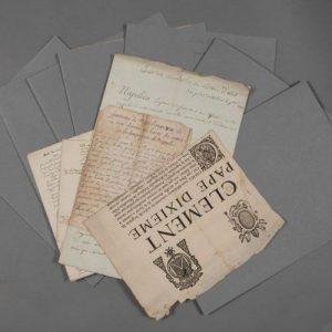 2 passeports imprimés en gothique (Bâle, 1765 et Ausgbourg ,avec belle gravure, 1763), armoiries peintes d'Honoré Chais (accordées par Léopold de Lorraine) + 2 autres blasons dessinés à l'encre et un texte manuscrit (XVIIIe), 4 documents divers concernant en particulier les Ursulines, un petit collet ancien noir à bords blancs, 22 petites cartes géographiques XVIIIe (régions de France, marges découpées), une circulaire imprimée concernant les écoles royales militaires (1814), pièce manuscrite signalant des partisans du duc de Berry, 2 généalogies manuscrites des familles Palerne et de La Fressange.
