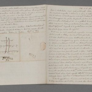 Jules Dumont d'Urville. L.A.S. à Louise de Croisilles. Toulon [à bord du vaisseau La Ville de Marseille], 14 novembre 1812. 3 pp. ½ in-4. Adresse au dos. Déchirure au second feuillet à l'ouverture de la lettre emportant quelques mots. Sur papier au double filigrane de Napoléon « Empereur et Roi » et de l'Empire français à l'aigle impérial.