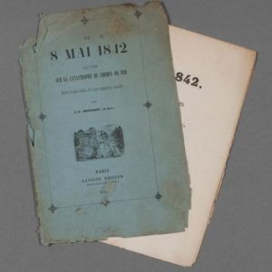 Jules Dumont d'Urville]. Le 8 mai 1842, satire sur la catastrophe du chemin de fer, suivie de notes inédites de la plus scrupuleuse exactitude par J.-F. Destigny (de Caen). Paris, Lavigne, 1842. Brochure in-8, 32 pp. (couverture abîmée).