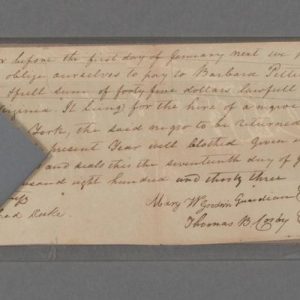 Contrat de « location » d'un esclave en Virginie par Barbara Pettus, pour la somme de 45$ « money of Virginia ». « [] for the hire of a negroe man named York, the said negro to be returned at the end of the present year ». Signé par les contractants. Au dos, mention de paiement. [La plantation de Barbara Pettus était basée dans le comté de Louisa, en Virginie].