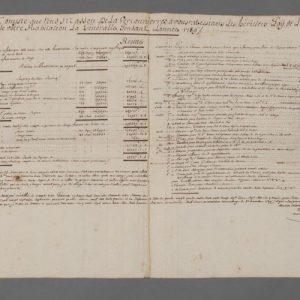« Compte que rend Masson de La Verronnière à vous messieurs les héritiers Po de l'administration de votre Habitation La Généralle pendant l'année 1789 ». Etat détaillé, mois par mois, des recettes (vente et expédition de sucre) et dépenses (fournitures, réparations, hôpital, raffinerie, transport, « toile pour habiller les nègres », ou encore « pour dix têtes de nègres à 2400# chaque »). En troisième page figure un inventaire du « mobilier » : « bêtes à cornes », « bêtes cavalines » et esclaves. « Il existait le 1er janvier 1789 347 nègres. Il en est né 6. Il en a été acheté 10. Il devrait en exister le 31 décembre 363. Mais il en est mort 9. Reste 354 ».