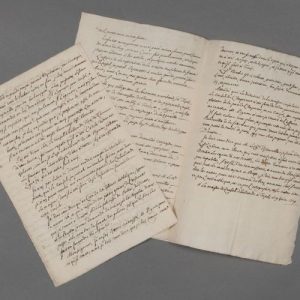 Copie d'époque d'une importante lettre diplomatique, compte-rendu d'une mission faite au nom du Roi auprès du pacha de Tripoli, qui se termina par la signature d'un traité de paix le 9 juin 1729, visant à protéger les navires français des pirates barbaresques, racheter et ramener des esclaves chrétiens. En-tête figure cette mention : « De la rade de Tripoli le 10 juin 1729. Lettre écrite par M. de Goujon à M. le comte de Maurepas ». [Afin de faire cesser les actes de piraterie des Tripolitains contre les navires français, la France avait bombardé Tripoli en juillet 1728. Le traité fut signé le 9 juin 1729. Mais les pillages et les agressions contre les équipages français se poursuivront encore longtemps].