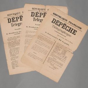 Siège et Commune de Paris. 4 affiches de dépêches télégraphiques du président du Gouvernement chef du pouvoir exécutif [Thiers]. 41 x 28 cm. Papier fragile, déchirures aux plis, quelques effrangures.