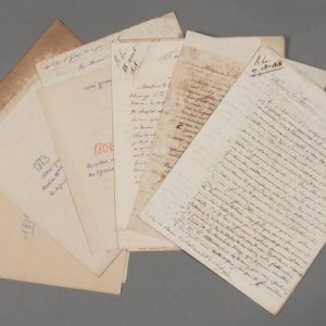 On joint : 6 intéressantes lettres de l'abbé Grenot, son chargé d'affaires à l'Épinoy, sur la mort de Mme d'Arlincourt, la gestion du domaine et surtout l'occupation par les troupes prussiennes (Hailles et l'Épinoy, 1806, 1813 et 1815) ; « Enfin ils sont partis ce matin ; nous sommes déprucianés : quelle triste mois de novembre nous avons passé ; le jour de la Toussaint nous avons logé 22 hommes et 25 chevaux ; l'espace de 18 jours nous avons logé 8 soldats, un officier et un sergent : les billes rouges et demi-rouges de billard sont prises, elles sont parties pour la Prusse avec mon canif ; je vous prie de m'en acheter un, qu'il soit simple avec une seule lame, mais qu'elle soit bonne[] » + 2 L.A.S. du baron d'Arlincourt à Grenot, sur la succession et l'achat de la propriété de Hailles à M. Daucourt, accompagnées d'un état des comptes et d'un inventaire des effets à reprendre à Hailles (l'Encyclopédie, le vin et la bière, le piano, tous les livres, etc.) signé par le baron d'Arlincourt.