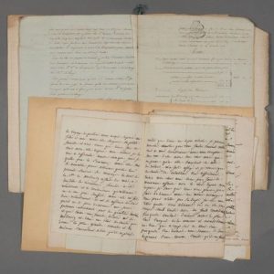 - 6 lettres de son chargé d'affaires, accompagnées d'une quinzaine de documents épinglés : quittances, notes, comptes, brouillon de lettre au ministre des Finances, etc., ainsi qu'un certificat d'inscription au livre des pensions, une belle facture à en-tête du premier bonnetier de l'impératrice Joséphine, etc.
