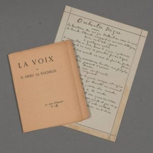 On joint un jeu d'épreuves de l'E.O. de La Voix, de Drieu La Rochelle, imprimé par Frédéric Paillart, à Abbeville, 1928. In-16 carré. En feuilles, partiellement coupé. Quelques pliures ou petites effrangures.