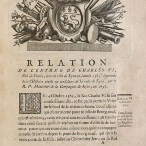 [MESSIEURS DU CONSULAT]. RELATION DES ENTRÉES SOLEMNELLES (sic) DANS LA VILLE DE LYON, DE NOS ROIS, REINES, PRINCES, PRINCESSES, CARDINAUX, LÉGATS, & AUTRES GRANDS PERSONNAGES, DEPUIS CHARLES VI, JUSQUE À PRÉSENT. Imprimé pour Messieurs du